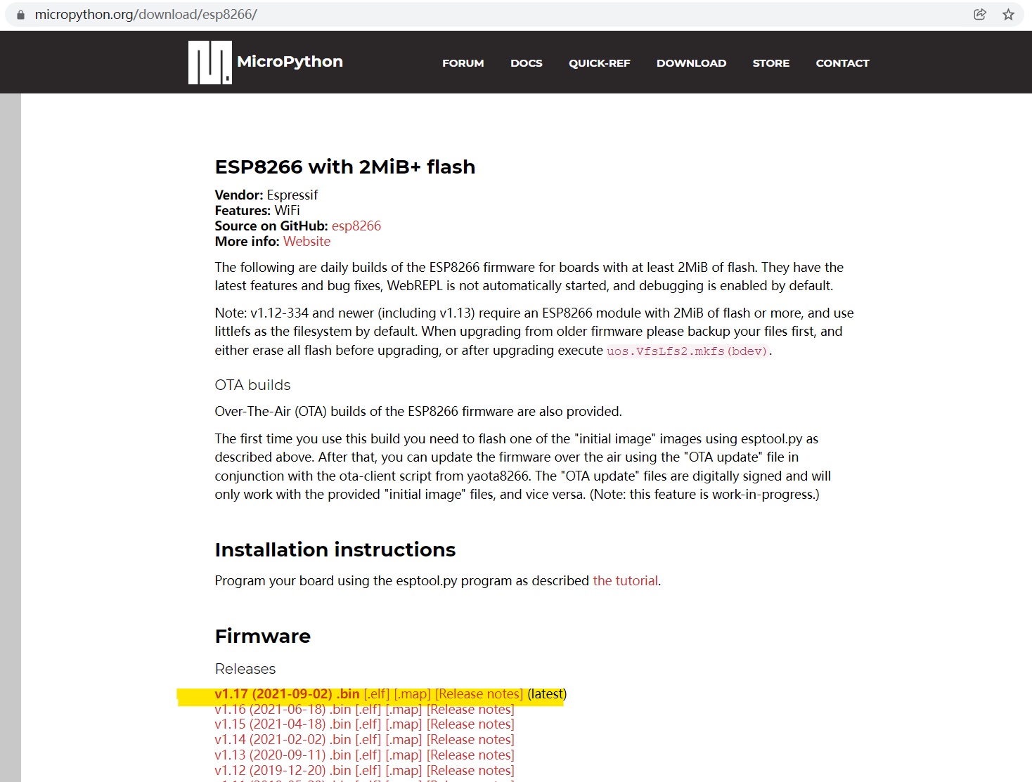 - 下载固件:打开MicroPython官网,选择最新的Releases下载(普通版本或者OTA兼容皆可)。