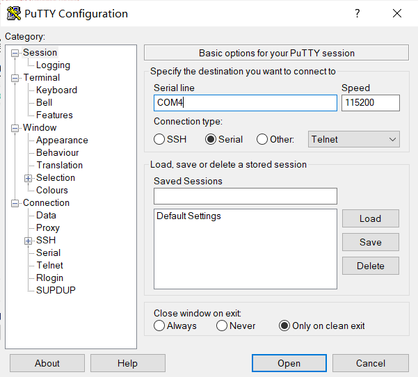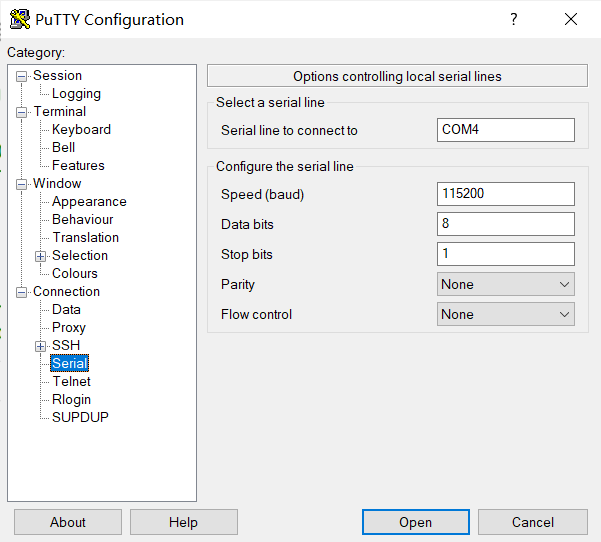 - 配置完成后点击open,打开会话窗口,按下开发板上的RST(Reset)键将开发板复位。