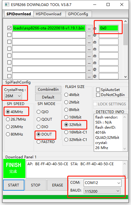 - 烧录固件:打开下载好的烧录工具,按照安信可官方的说明配置烧录工具,将第三步下载好的固件烧写进开发板的0x000位置。稍等一段时间,直到工具显示完成。